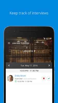 Because you work in hospitality, you're not always near your computer, which is why we created the Harri Hire™ mobile app. - Search our hospitality network for the type of talent your business needs and invite them to apply to your open positions - Communicate with applicants from anywhere - Keep track of who your are going to interview as well as the date and time all from your mobile device!